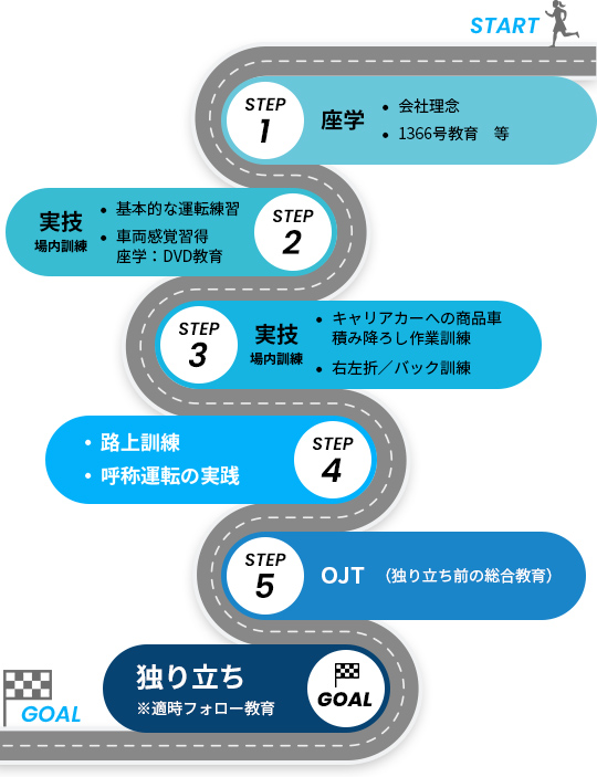 特にドライバーの場合は、主に群馬県太田市の本部にて教育専門部署の指導員が担当し、長期間(数週間~数か月程度)の研修を実施しています。